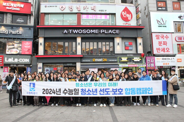 수원시가 2024년 대학수학능력시험일인 14일 저녁 수원역 로데오거리 일원에서 청소년 보호와 유해환경 개선을 위한 합동 캠페인을 펼쳤다.