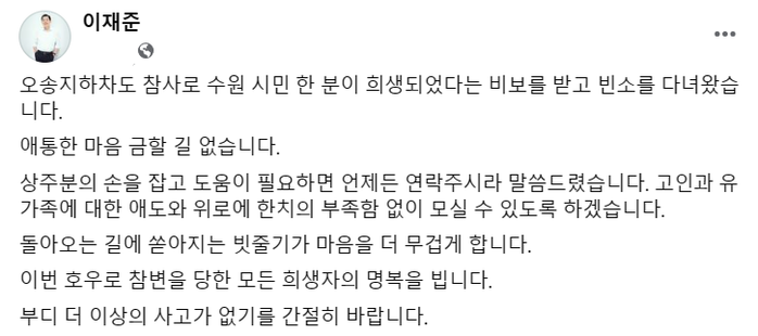 18일, 이재준 시장은 자신의 페이스북을 통해 “오송지하차도 참사로 수원 시민 한 분이 희생되었다는 비보를 받고 빈소를 다녀왔다”며 “애통한 마음 금할 길 없다”고 말했다.