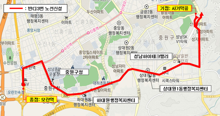 반디 3번 노선은 사기막골~성남하이테크밸리~상대원1동~하대원동~중원구청~모란역 등 왕복 13.4㎞ 구간의 중원지역을 운행한다.