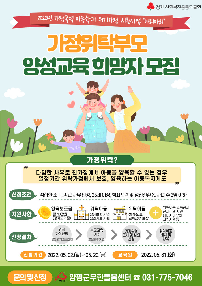 양평군 무한돌봄센터에서는 오는 5월 31일 초록우산 어린이재단 경기남부가정위탁지원센터와 연계해 위탁부모 양성교육을 실시한다고 밝혔다. 교육신청은 5월 2일부터 20일까지 전화(☎ 031-775-7046)로 신청하면 된다.