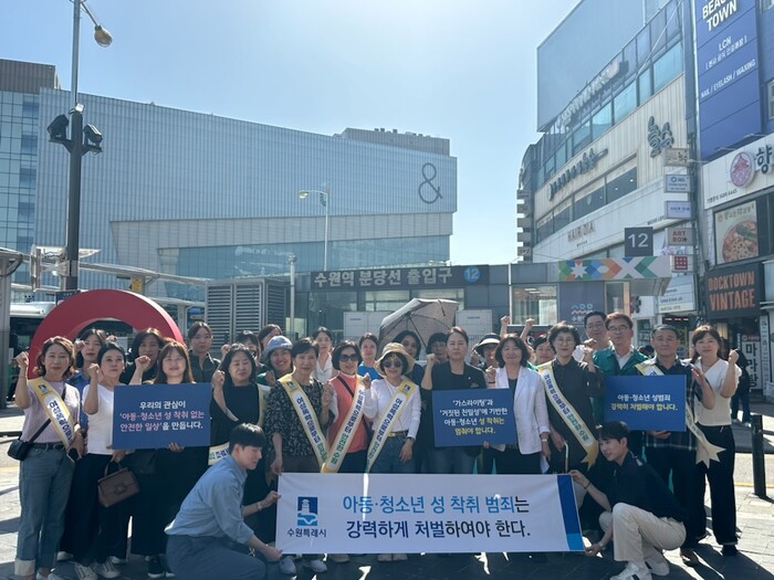수원시, 수원시여성리더회, 수원시청소년성문화센터, 성매매피해상담소 관계자 30여 명이 청소년이 많이 찾는 수원역 일대를 돌며 ‘안전한 환경 조성’, ‘성착취 금지’ 등 메시지를 전달했다.