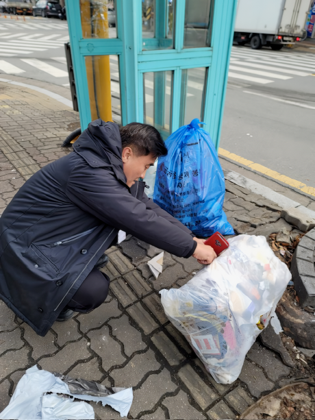 사진/수원시 깨끗한 쓰레기처리 감시원이 무단 배출된 생활폐기물을 살펴보고 있다.(사진제공=수원시)