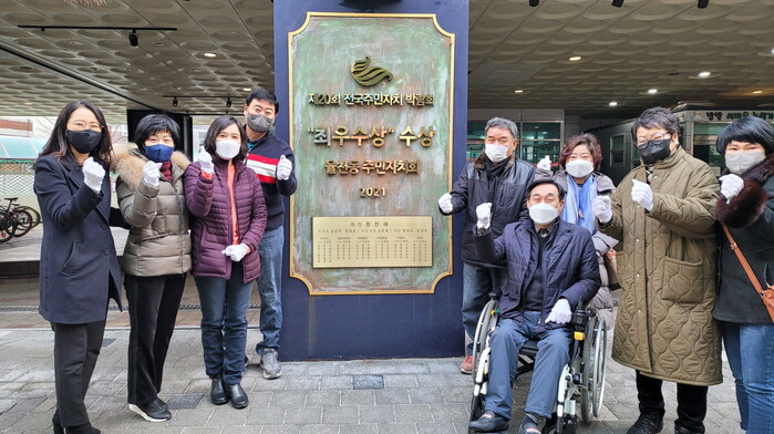 사진/ 율천동 주민자치회가 지난해 제20회 전국주민자치 박람회 최우수상을 수상 기념으로 현판을 세우고 기념촬영을 하고 있다.(사진제공=수원시)