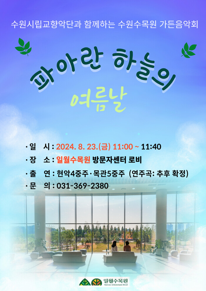 수원시(시장 이재준)는 8월 23일 오전 11시 일월수목원 방문자센터에서 가든음악회 ‘파아란 하늘의 여름날’을 연다.