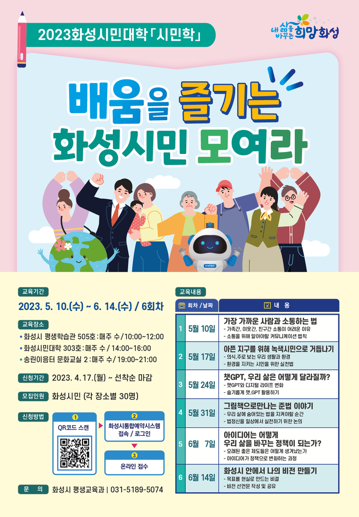 화성시(시장 정명근)가 2023년 화성시민대학 시민학 과정 ‘배움을 즐기는 화성시민 모여라!’수강생을 모집한다.
