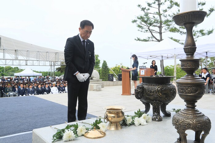이날 추념식은 전국적으로 울린 사이렌 소리에 맞춰 순국선열 및 호국영령에 대한 묵념을 시작으로 헌화와 분향, 추념사 낭독, 헌시 낭송, 현충일 노래 제창 순으로 진행됐다.
