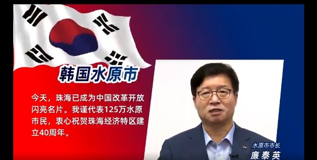 염태영 시장은 축하 영상에서 “40년 전 주하이시가 중국의 첫 경제특구 중 하나로 지정된 후 낚시를 하던 뱃길은 해상 실크로드가 됐고, 주하이시는 중국의 개방정책을 상징하는 가장 빛나는 이름이 됐다”며 “주하이시의 경제특구 건립 40주년을 125만 수원시민과 함께 진심으로 축하드린다”고 말했다.