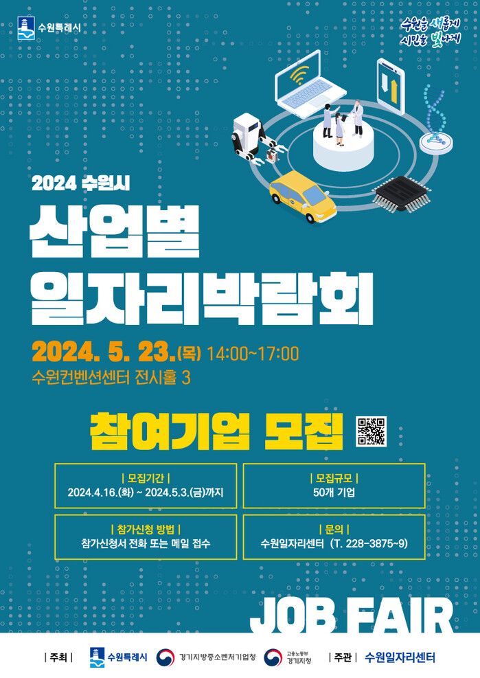 수원시(시장 이재준)가 ‘2024 수원시 산업별 일자리박람회’에 참여할 기업을 5월 3일까지 모집한다.