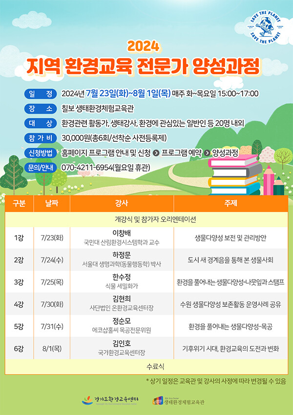 수원시 칠보 생태환경체험교육관이 ‘2024년 지역 환경교육 전문가 양성 과정’ 수강생을 모집한다.
