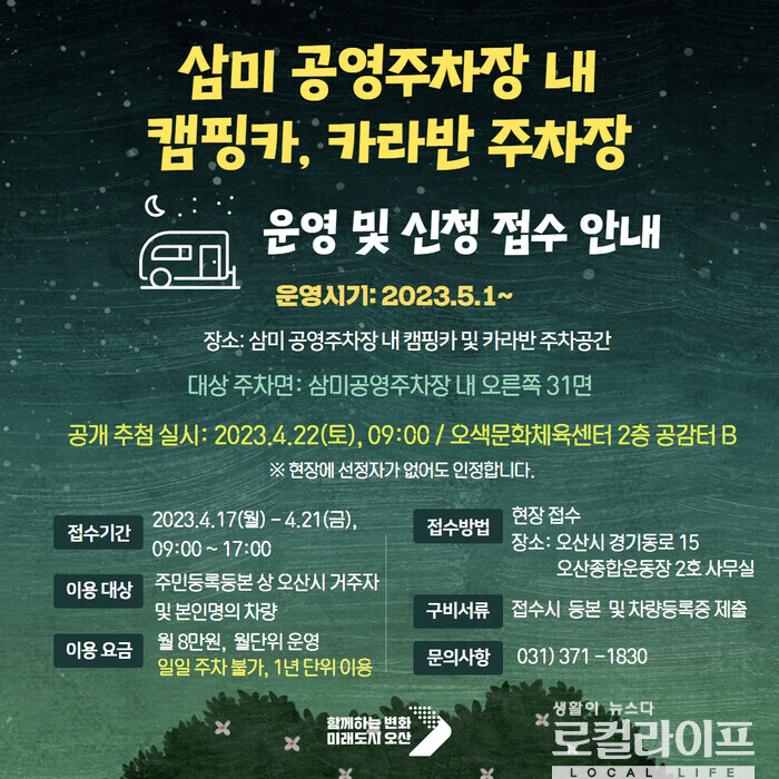 [오산=로컬라이프] 송준형 기자 = 오산시가 삼미공영주차장 일부를 캠핑카와 카라반전용주차장으로 활용할 방침이다.
