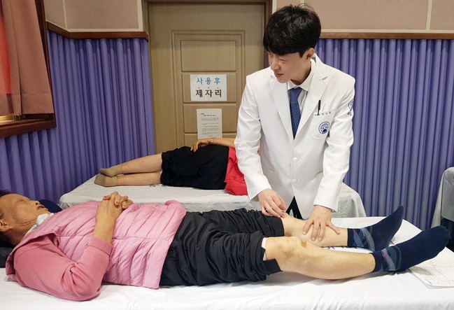 <사진/ 청주자생한방병원 최우성 병원장이 진료소를 찾은 환자에게 침치료를 실시하고 있다>