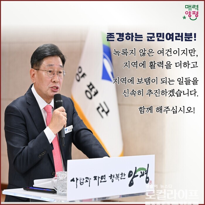 이어 “이는 군민 여러분과 함께 이 어려운 시기를 극복해 나가기 위한 계기를 마련하기 위함이다. 취임사에서 언급했듯이, ‘한겨울 외딴 집에서 떨고 있는 독거노인의 아픔은 제 책임이어야 합니다’라고 다짐했다”며 “현재 경기가 어려운 것은 누구의 잘못도 아니지만, 양평군수로서 저는 무거운 책임감을 느낀다. 여건이 녹록지 않지만, 지역에 활력을 불어넣고, 지역 경제에 보탬이 되는 일들을 신속하게 추진해 나가겠다”고 강조했다.
