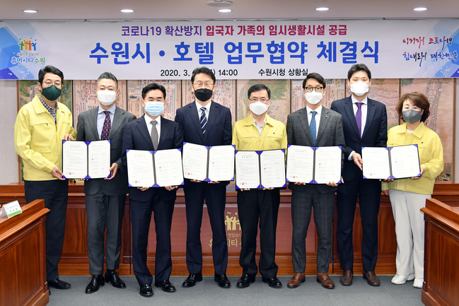 수원시와 밸류 하이엔드호텔 수원·이비스 앰배서더 수원·노보텔 앰배서더 수원·라마다프라자 수원·코트야드 메리어트 수원 등 5개 호텔은 27일 수원시청 상황실에서 업무협약을 체결하고, 해외입국자가 자택에서 자가격리를 하는 동안 수원에 거주하는 가족이 호텔을 저렴한 가격에 이용할 수 있도록 협력하기로 했다.
