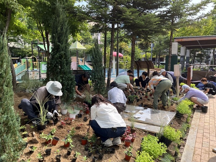 수원시(시장 이재준)가 27일 광교카페거리발전위원회, 새빛수원손바닥정원단과 함께 영통구 물봉선어린이공원에 마을정원을 조성했다.