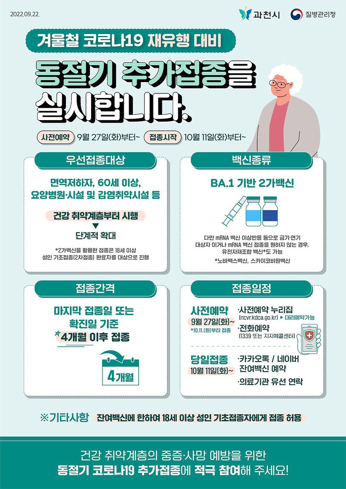 김향희 과천시보건소장은 “겨울철 코로나19 재유행, 독감의 동시 유행에 대비하려면 감염취약시설과 고령층 등 건강 취약계층의 동절기 추가 접종이 매우 중요하다. 동절기 추가 예방접종에 시민들의 적극적인 참여를 바란다”라고 말했다.
