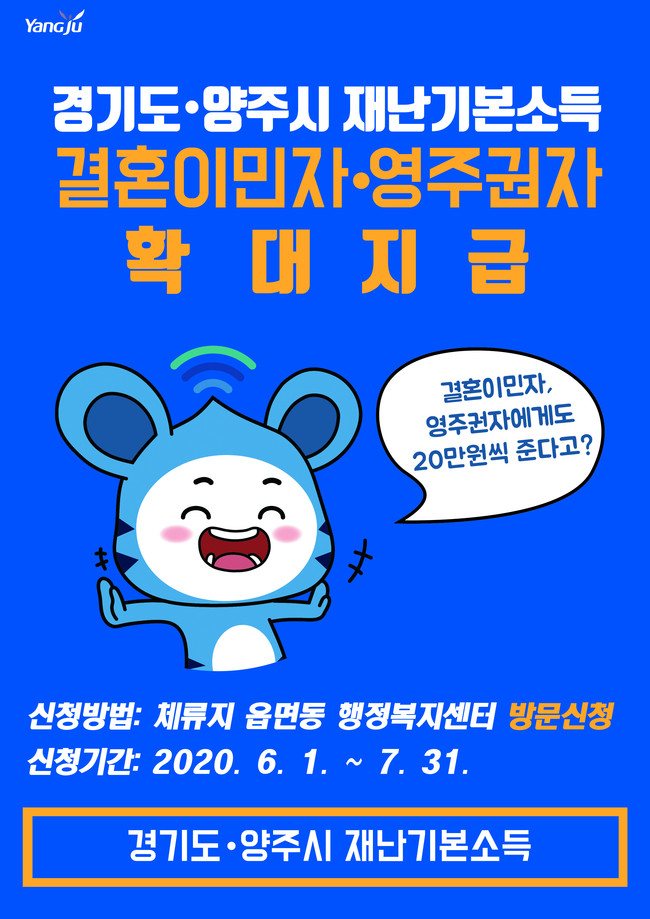 시는 2020년 5월 4일 24시 이전부터 신청일 현재까지 양주시에 외국인등록이 돼 있는 결혼이민자와 영주권자에게 재난기본소득을 지급한다고 밝혔다.