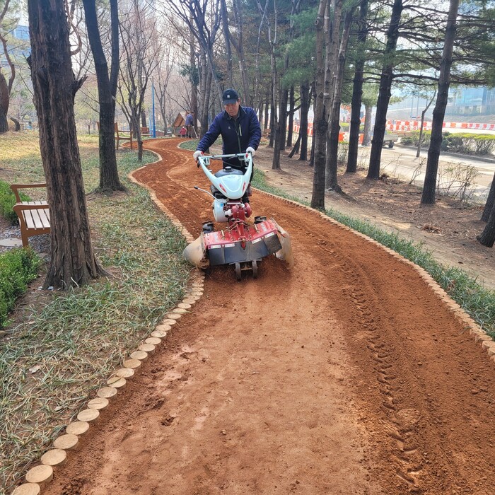 한편 수시 관리가 필요한 황토를 소재로 만든 숲속황톳길은 밀착으로 관리하는 도시녹지관리원을 상시 배치하여 밟을수록 단단하게 굳어지는 황톳길을 매일 1회 이상 전문 관리기로 갈아엎어 부드럽게 고르는 작업을 실시하며 관리함으로써 안전하고 쾌적한 맨발길 상태로 유지하고 있어 시민들의 큰 호응을 얻고 있다.