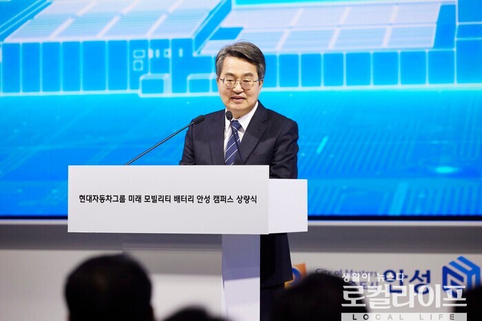 | ▲ 김동연 경기도지사가 '현대자동차그룹 미래 모빌리티 배터리 안성 캠퍼스 상량식'에 참석해 축사를 하고 있다. (사진출처=김동연 페이스북) |