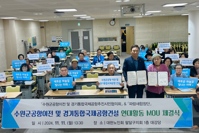 [로컬라이프] 수원군공항이전 및 경기통합국제공항 추진 시민협의회(이하 시민협의회)는 지난 11일 파랑새합창단(대한노인회 팔달구지회 소속 시니어합창단)과 수원군공항 이전 및 경기통합국제공항 건설을 위한 상호협력 협약(MOU)을 체결했다.