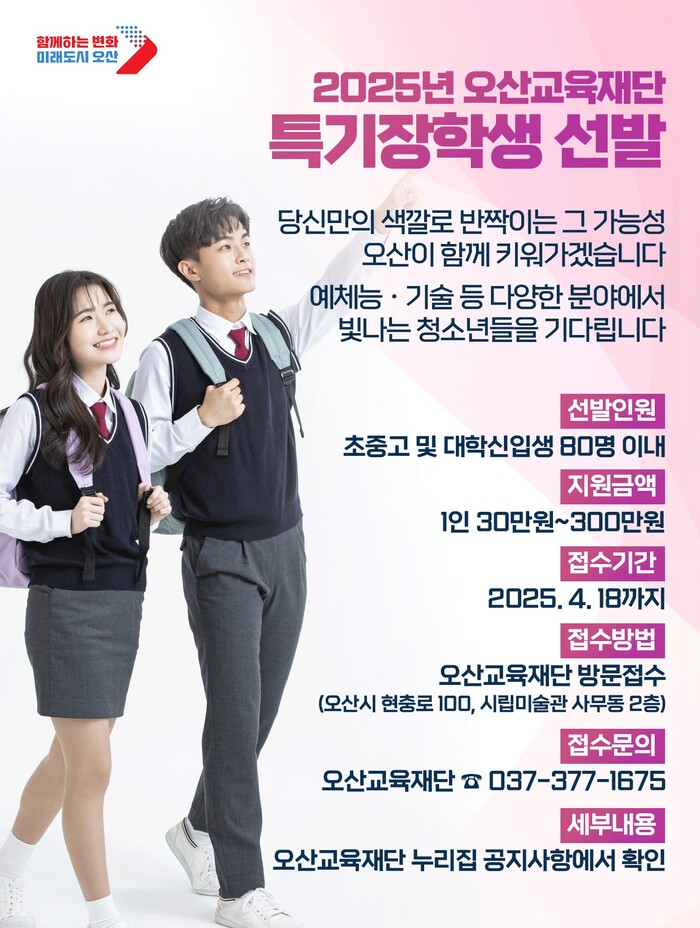 [오산=로컬라이프] 송준형 기자 = 오산시는 학업뿐만 아니라 예체능·기술 등 다양한 분야에서 눈부신 가능성을 보여주고 있는 청소년 특기장학생 선발을 위한 신청접수를 받고 있다.