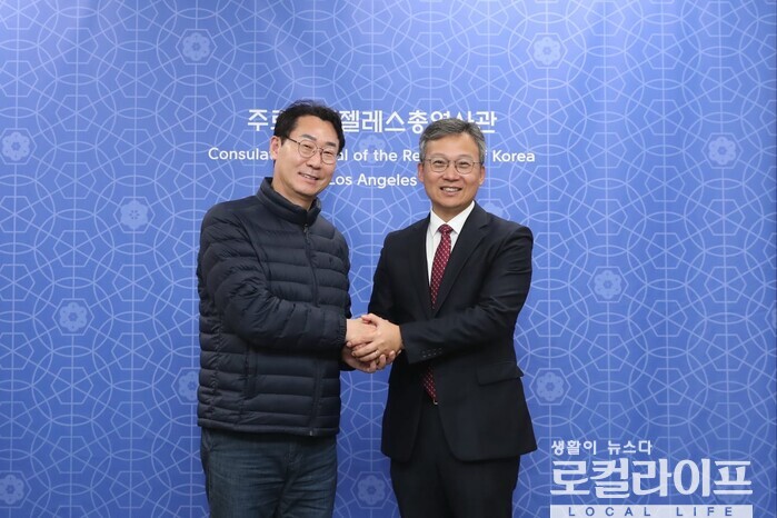 [화성=로컬라이프] 송준형 기자 = 미국 출장 중인 정명근 화성시장이 주LA 총영사관을 방문해 김영완 총영사와 환담을 나누었다.