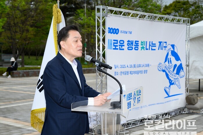 | ▲ 이재준 수원특례시장이 ‘2025 지구의날 기념 새로운 행동 빛나는 지구’ 행사에 참석해 축사를 하고 있다. (사진출처=이재준 페이스북) |