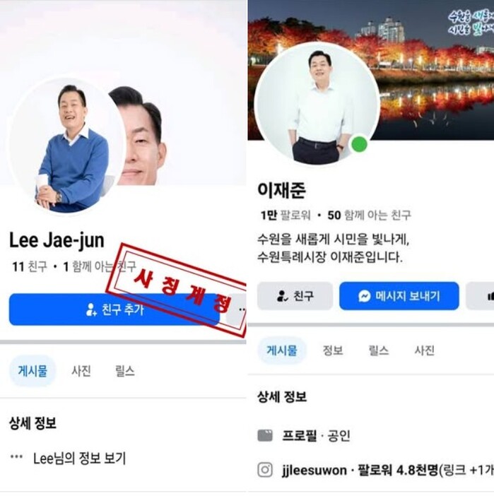 | ▲ 이재준 수원특례시장 페이스북 실제 계정(오른쪽)과 사칭 계정(왼쪽) 비교 이미지. (사진출처=이재준 페이스북) |