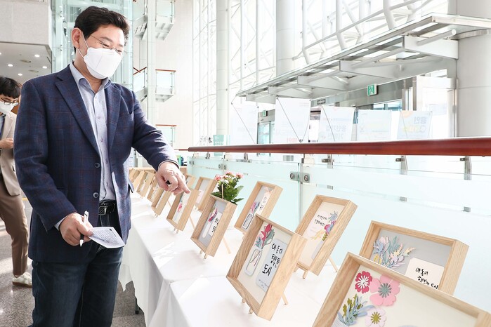이상일 시장은 보고회에 앞서 아동참여위원들이 만든 정책제안보드와 캘리그라피 작품을 모두 살펴봤다.