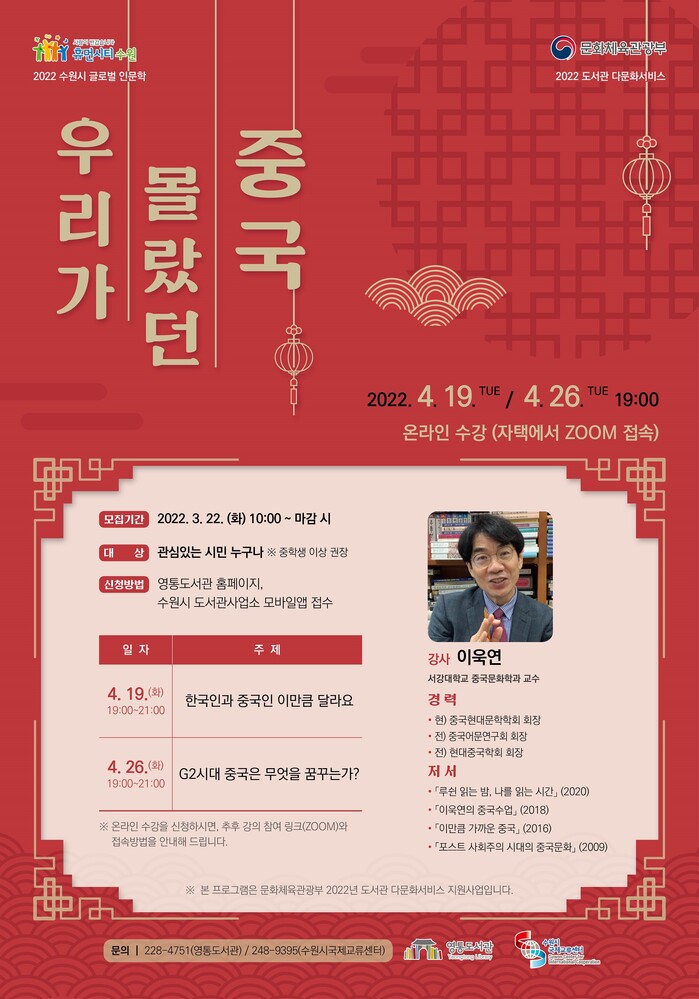 수원시 영통도서관이 2022년도 수원시 글로벌 인문학 1·2회차 ‘우리가 몰랐던 중국’ 참가자를 3월 22일부터 선착순으로 100명 모집한다.