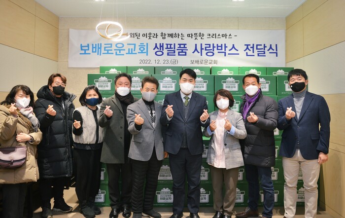 보배로운교회 류철배 목사는 23일 교회(영통구 영통로501번길 1-7)에서 김기배 수원시 문화청년체육국장에게 생활필수품 상자(총 1300만 원 상당)를 전달했다.