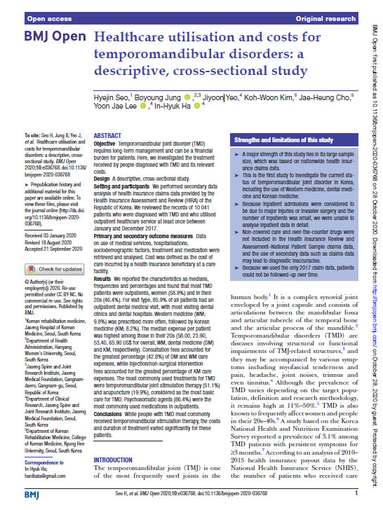 이에 자생한방병원 척추관절연구소(소장 하인혁) 서혜진 한의사 연구팀은 턱관절 환자의 특성과 치료 현황을 살펴보았다. 해당 논문은 SCI(E)급 국제학술지 ‘BMJ Open (IF=2.496)’ 10월호에 게재됐다.