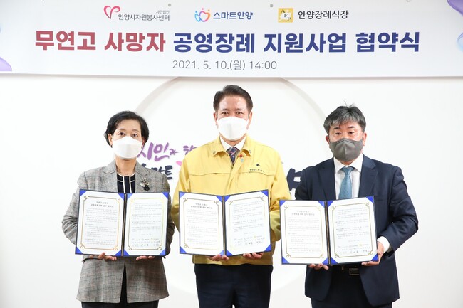 [로컬라이프] 안양시는 10일 청사에서 최대호 안양시장·박양숙 안양시자원봉사센터 소장·최홍준 안양장례식장 대표간에 무연고 사망자의 공영장례 지원을 위한 협약을 맺었다고 밝혔다.