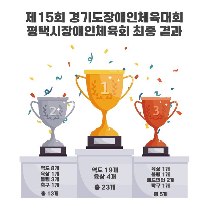 이와 관련해 정장선 평택시장은 28일, 자신의 페이스북을 통해 “4월 24일부터 26일까지 가평에서 열린 경기도장애인체육대회에서 평택시 선수들이 좋은 성적을 거두고 돌아왔다”며 “총 13개 종목에 참여한 우리 선수들은 역도, 육상, 볼링, 축구, 배드민턴, 탁구 종목에서 금메달 23개, 은메달 13개, 동메달 5개를 획득했다”고 밝혔다.
