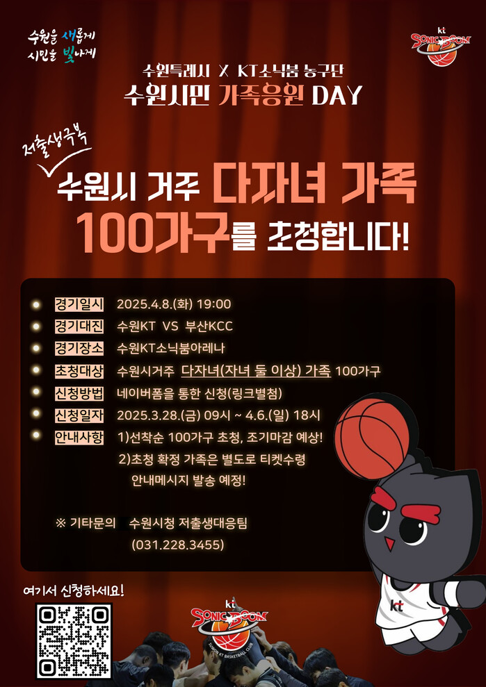 첫 일정은 4월 8일 열리는 수원KT소닉붐아레나에서 열리는 수원 KT 소닉붐 대 부산 KCC 이지스의 농구 경기다. 3월 28일 오전 9시부터 다자녀 가구 100가구를 대상으로 선착순 신청을 받는다. 홍보물 포스터에 있는 QR코드에 연결된 웹페이지에서 신청하면 된다.