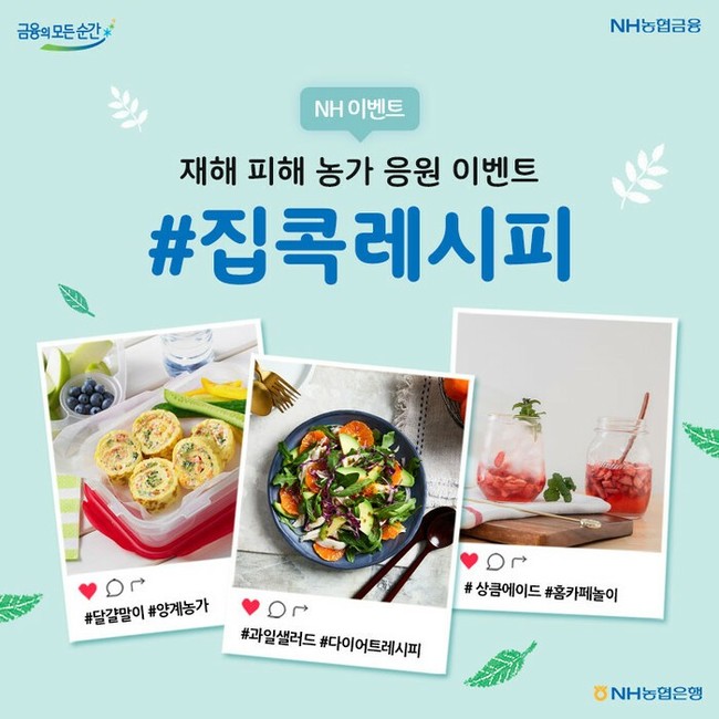 NH농협은행은 우리 농·축산물을 활용한 ‘나만의 집콕레시피 SNS 공유 이벤트’를 실시한다고 9일 밝혔다.