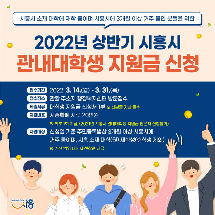 시흥시(시장 임병택)는 관내 대학생의 더 큰 성장을 도울 지원금 접수를 오는 14일부터 31일까지 동별 행정복지센터에서 신청·접수받는다.