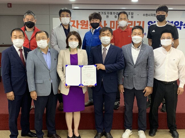 사진/임숙자 수원시자원봉사센터장(앞줄 왼쪽 3번째), 박형구 경기도자동차검사정비조합 수원협의회장(앞줄 오른쪽 3번째) 등 협약 관계자들이 함께하고 있다.(사진제공=수원시)