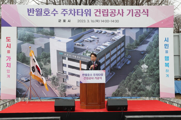 군포시는 3월 16일 둔대동 345-1번지(주차장 부지)에서 하은호 군포시장과 이길호 시의회의장, 이학영 국회의원, 도⦁시의원, 대야동 주민대표 등이 참석한 가운데 반월호수 주차타워 건립공사 기공식을 개최했다.