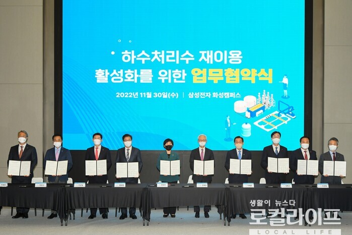 [수원=로컬라이프] 송준형 기자 = 환경부와 경기도, 수원특례시, 용인특례시, 화성시, 평택시, 오산시, K-water(한국수자원공사), 한국환경공단, 삼성DS부문은 30일, 삼성전자 화성캠퍼스에서 ‘하수처리수 재이용 활성화를 위한 업무협약’을 체결했다.