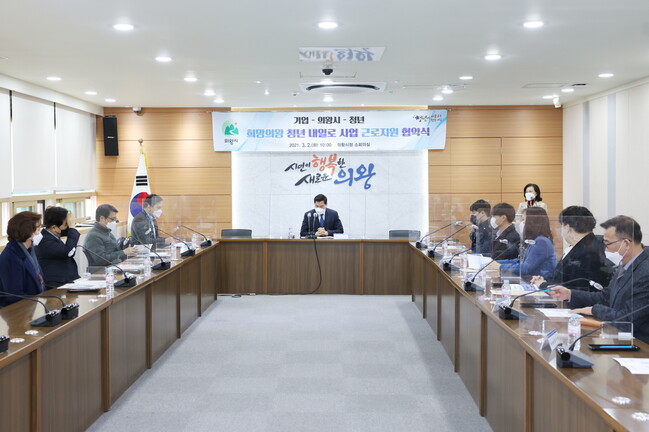의왕시(시장 김상돈)는 2일 2021년 지역주도형 청년일자리사업인‘희망의왕 청년 내일로 사업’에 선발된 관내 4개 기업 및 기업에서 고용한 청년 4명과 함께 근로지원 협약을 체결했다.