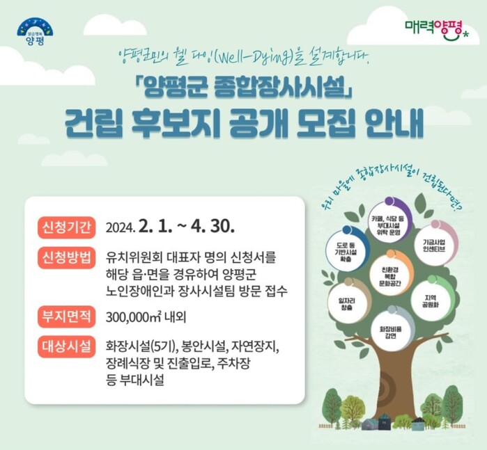 이와 관련해 전진선 양평군수는 21일, 자신의 페이스북을 통해 그 일환으로, 양평군민의 웰 다잉(well-dying)을 설계하는 “양평군 종합 장사시설 건립 후보지”를 공개 모집한다고 밝혔다.