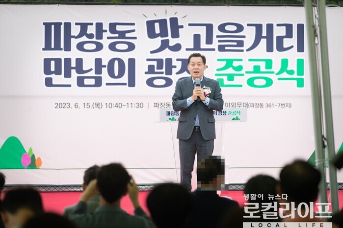 | ▲ 이재준 수원특례시장이 “파장동 맛고을거리 ‘만남의 광장’ 준공식”에 참석해 인사말을 하고 있다. (사진출처=이재준 페이스북) |
