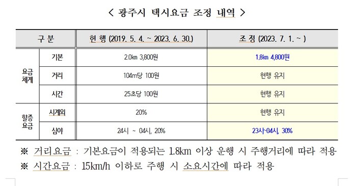 광주시는 내달1일 오전4시부터 지역 내 중형택시 기본요금을현행2km 3,800원에서1.8km 4,800원으로인상한다고22일 밝혔다.이는2019년5월4일 요금 인상 이후4년2개월만이다.
