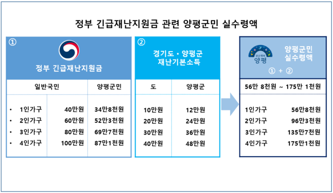 정부가 발표한 긴급재난지원금 액수는 4인 이상 가구 100만원, 3인 가구 80만원, 2인 가구 60만원, 1인 가구 40만원이나, 재난기본소득을 이미 지급하고 있는 양평군과 경기도는 국비에 해당되는 지원금(약 87%)만 지급하며, 따라서 4인 이상 가구는 87만1천원, 3인 가구는 69만7천원, 2인 가구는 52만3천원, 1인 가구는 34만천원의 정부 긴급재난지원금을 받을 수 있다.