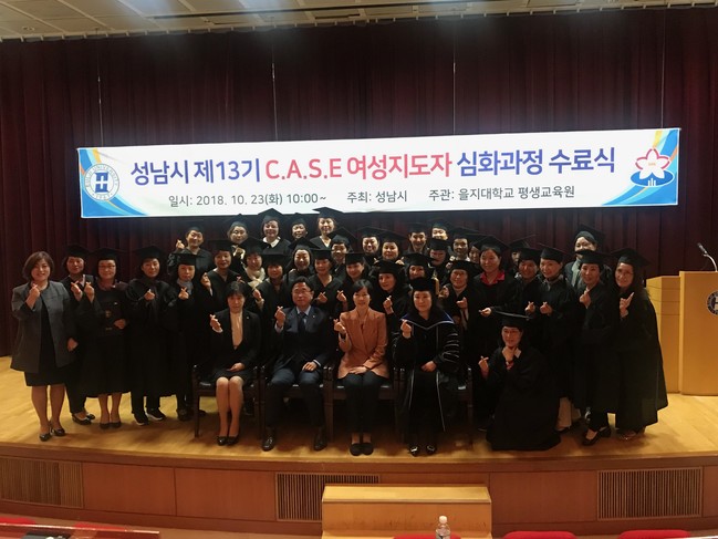 [성남=한국내츄럴타임즈] 박현우 기자 = 성남시(시장 은수미)는 10월 23일 오전 10시 수정구 양지동 을지대학교 을지관 8층 밀레니엄홀에서 ‘13기 성남시 여성지도자 심화과정 수료식’을 열었다. 그리고 이날 40명이 학사모를 썼다.