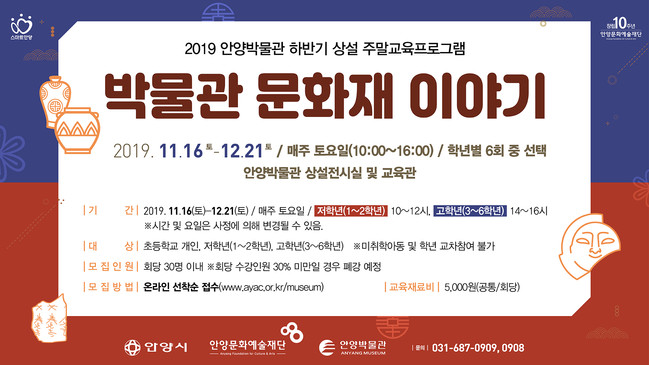[안양=로컬라이프] 송준형 기자 = 안양박물관은 11월 16일부터 초등 개인을 대상으로 한 교육프로그램 [박물관 문화재 이야기]를 운영한다. 이 프로그램은 상반기에 성황리에 진행되었던 지역문화예술 플랫폼 육성사업 [박물관 문화재 이야기]에서의 주제였던 선사~통일신라 시대를 이어 고려~조선시대를 주제로 한 프로그램이다.
