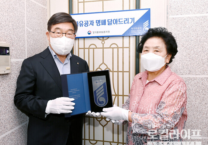 ▲ 신동헌 경기도 광주시장(왼쪽)이 고 임성재 님의 유가족 임조순 씨(오른쪽)에게 '국가유공자 명패'를 전달하고 있다. (사진출처=신동헌 페이스북)