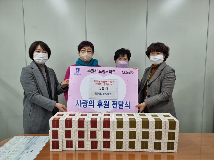 한국농식품여성CEO연합회 경기지회가 “수원시 드림스타트 아동 가정에 전달해 달라”며 수원시에 명인 고추장·된장 30세트를 기부했다.