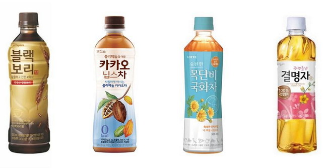 사진/ (왼쪽부터) 하이트진로음료 ‘블랙보리’, 일동후디스 ‘후디스 카카오닙스차’, 롯데칠성음료 ‘목단비 국화차’, 웅진식품 ‘광명찾은 결명자’