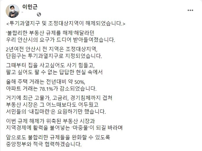 10일, 이민근 시장은 자신의 페이스북을 통해 “투기과열지구 및 조정대상지역이 해제되었다”며 “‘불합리한 부동산 규제를 해제’해달라던 우리 안산시의 요구가 드디어 받아들여졌다”고 강조했다.